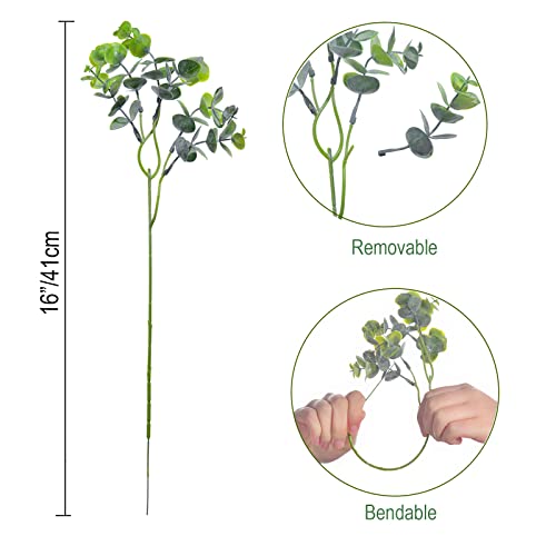 - Material: These eucalyptus stems leaves are made of high quality plastic and the stems are iron wire inside, you can bend the stems into any shapes you needed. Each stem is detachable so you can reduce the volume to your liking. The size of leaves from large to small, which looks more real and nature vivid.