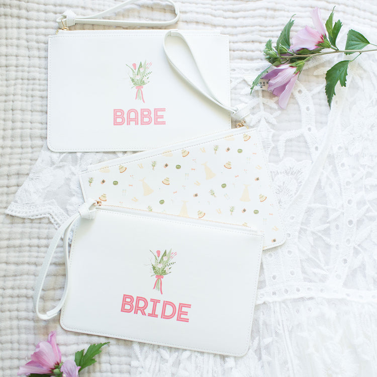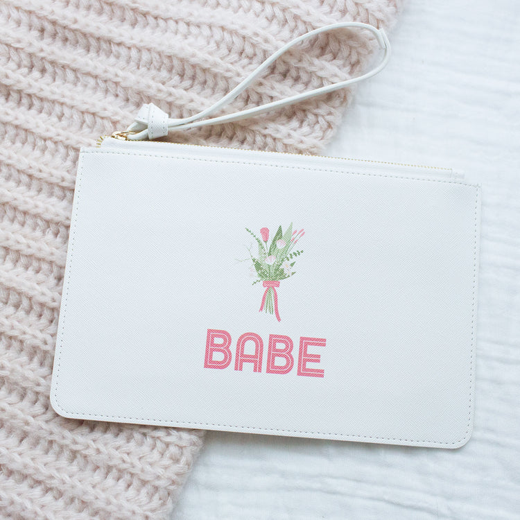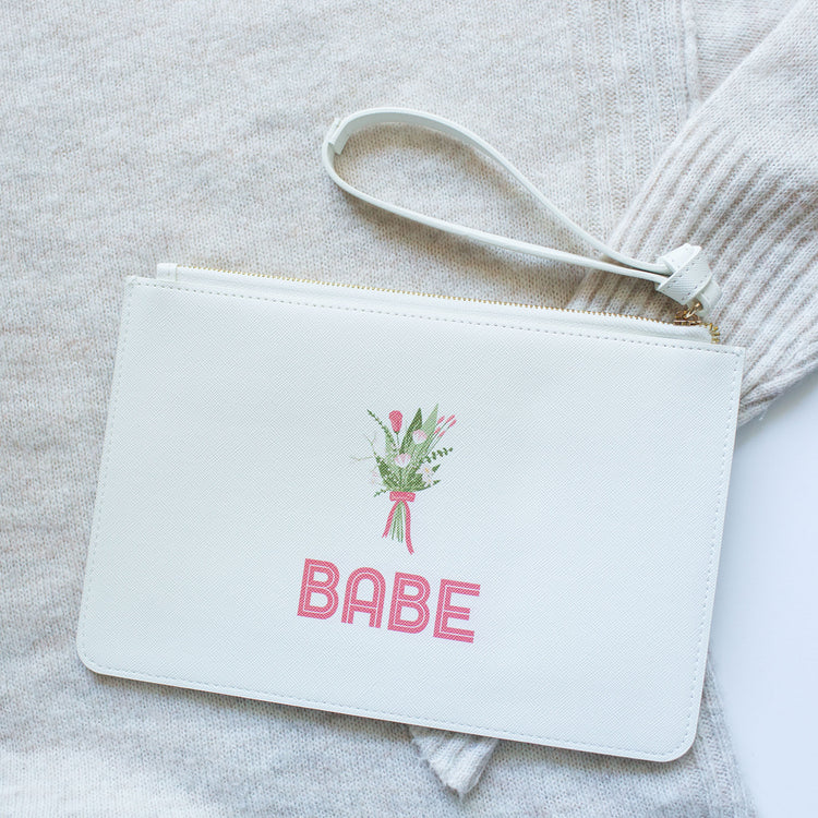 Designed with a loop handle to quickly free your hands, this custom clutch bag is made for the fashionista on the go. It can hold everyday essentials such as a phone, wallet, and keys. It features a zip fastening and a fully lined internal pocket. It is made of vegan leather in the Saffiano pattern finish.