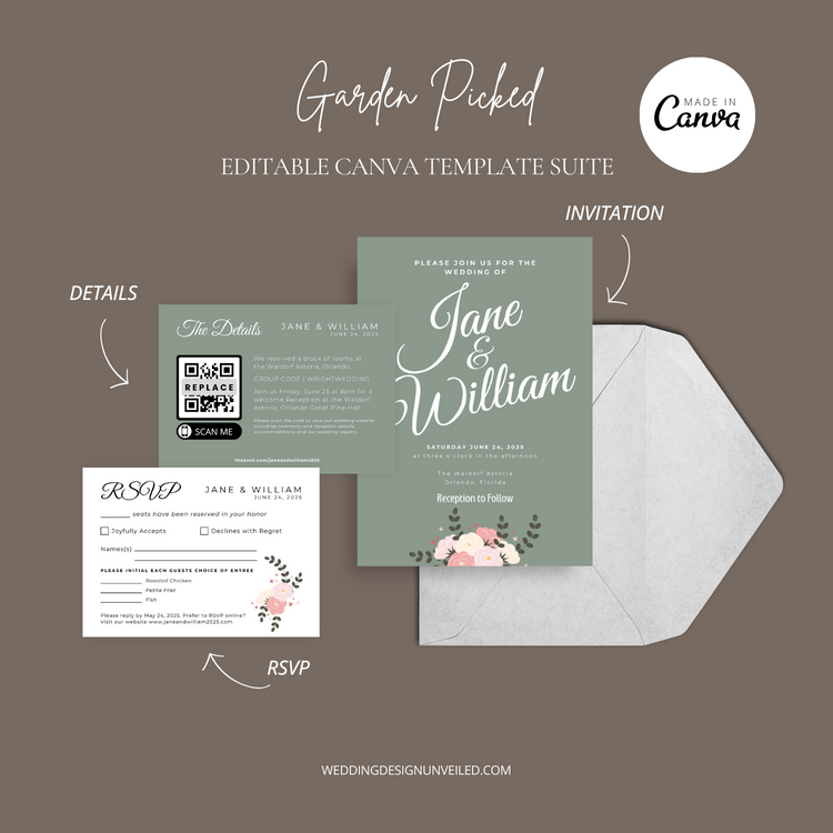 Your garden or outdoor wedding deserves a theme that captures the natural beauty of your chosen venue. Our Canva editable garden wedding bundle is here to help you create that picture-perfect look. This comprehensive bundle includes editable Canva templates for all the essential elements: Save the Date, Wedding Invitation, Details Card, RSVP Card, Welcome Sign, Seating Sign, Menu, Table Numbers, and Thank You Card.