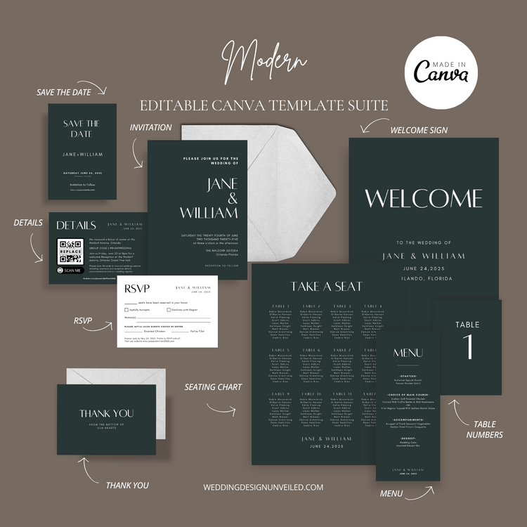 Your wedding day should feel effortlessly chic and sophisticated. Our Canva editable wedding bundle is here to make that vision a reality. This comprehensive bundle includes editable Canva templates for essential wedding elements: Save the Date, Wedding Invitation, Details Card, RSVP Card, Welcome Sign, Seating Sign, Menu, Table Numbers, and Thank You Card.