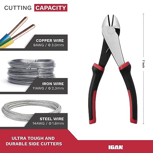 Details: IGAN-DC7 The Heavy-duty, Durable, Wire cutters IGAN was originally founded in 2002 with an independent team of laboratory engineers. Specializing in the development and design of accessories for hand tools, automotive supplies, sports facilities, and fishing industries. Tough and Durable The IGAN Dikes cutters are forged from tempered high carbon steel and the cutting edges are hardened by induction heating and quenching, provides superior cutting ability and cutting edge life. High-leverage The pivot is closer to the cutting jaws, which will increase leverage and thus Cutting efficiency. Superior Labor-saving Tools A spring-loaded mechanism that opens the handles automatically after every cut. Ideal for repetitive work to minimize hand fatigue. Cutting Ability Steel wire Φ1.6 mm(0.063 inch) Iron wire 11 AWG(Φ2.3mm) Copper wire 9 AWG(Φ3.0mm) Soft wire 9AWG Plastic Φ4.0mm Comfortable Padded Handles It is wider and thicker than the dipped handles. Can greatly reduced hand strain on difficult repetitive cutting and provides a higher performance. Warranty At IGAN, we back them all with a full lifetime warranty and provide friendly, easy-to-reach support, and Free Lifetime Technical Support also. Don't Waste Another Minute! Click Add To Cart Before We Run Out Of Stock!